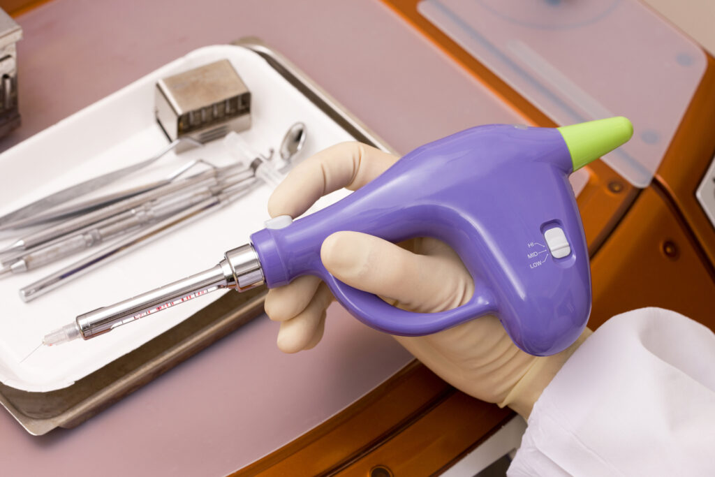 当院では治療の内容や患者様のご希望に合わせて歯科局所麻酔を行います。注射には麻酔時の痛みの原因である注射圧とスピードをコントロールする電動注射器を使用しています。麻酔前に粘膜に塗る表面麻酔もありますので麻酔が苦手な方はお知らせください。